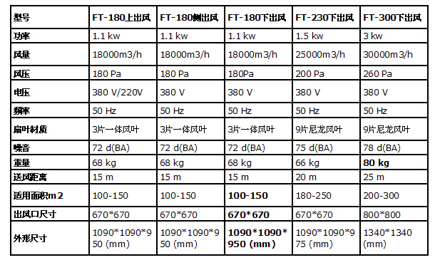 FT-300環(huán)?照{(diào):風(fēng)量為30000平方米,電機功率為3kw,送風(fēng)距離為30-50米左右,適用的面積在FT-250環(huán)?照{(diào):風(fēng)量為25000平方米,降溫覆蓋面積在200-250平方米,每個小時的蒸發(fā)量為112L/h,儲水量65L。