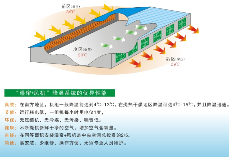 既然你能看到這樣的降溫方式可以里面清晰明了它的降溫方式后再了解下它的安裝方式都有幾種如圖: 方式一:橫向降溫方式 方式二:縱向降溫安裝 方式三:立式降溫方式 方式四:橫向抽風(fēng)方式 方式五:縱向抽風(fēng)方式 方式六:立式抽風(fēng)方式 福泰水簾+負(fù)壓風(fēng)機(jī)空氣對(duì)流降溫已經(jīng)在中小企業(yè)中應(yīng)用廣泛,空氣換氣率達(dá)到99%,輸送新鮮空氣改善車間高溫悶熱!如果在安裝中不能科學(xué)有方式的安裝可能會(huì)讓你安裝的水簾風(fēng)機(jī)效果不明顯哦!所以在安裝過(guò)程中水簾風(fēng)機(jī)是相對(duì)的位置安裝。今天的分享你能明白水簾和風(fēng)機(jī)細(xì)節(jié)方面的其中的方式了嗎!