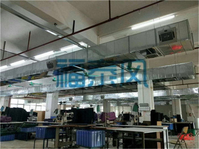 制衣車間人員密集、不通風、機器散熱等情況可采用整體降溫方案,每100平方米安裝一臺,整體降溫效果更好,改善更徹底,員工工作更舒適。 2、考慮到風量太大會影響針車生產(chǎn)、冷風不能直接對著設備吹、所以室內(nèi)需要安裝送風管道、針對每個工作崗位開風口、直接對著工作人員進行降溫。