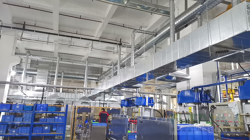方案二,廠房?jī)?nèi)生產(chǎn)人員較少,設(shè)備少,預(yù)算緊張時(shí),可考慮用崗位定點(diǎn)降溫。這時(shí)根據(jù)人員、設(shè)備分布的位置,用蒸花式水冷空調(diào)連接通風(fēng)管,把冷風(fēng)引至每個(gè)生產(chǎn)人員的位置,定點(diǎn)定位給員工降溫。在員工的頭頂有28度的冷風(fēng)一直吹,工人就不會(huì)有悶熱的體驗(yàn)這種方案投入少,運(yùn)行成本低,但只是有人的位置涼快,沒有人的位置不好意思,它就是會(huì)熱。